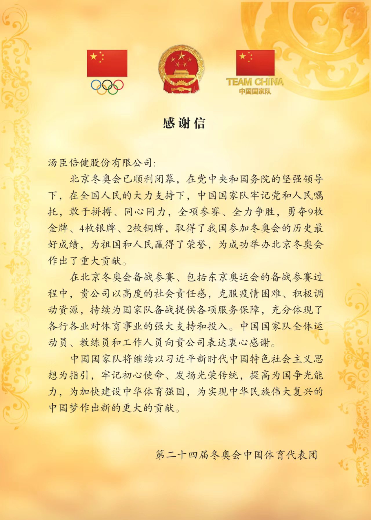 尊龙凯时助力中国队征战冬雪赛场,中国体育代表团致信感谢