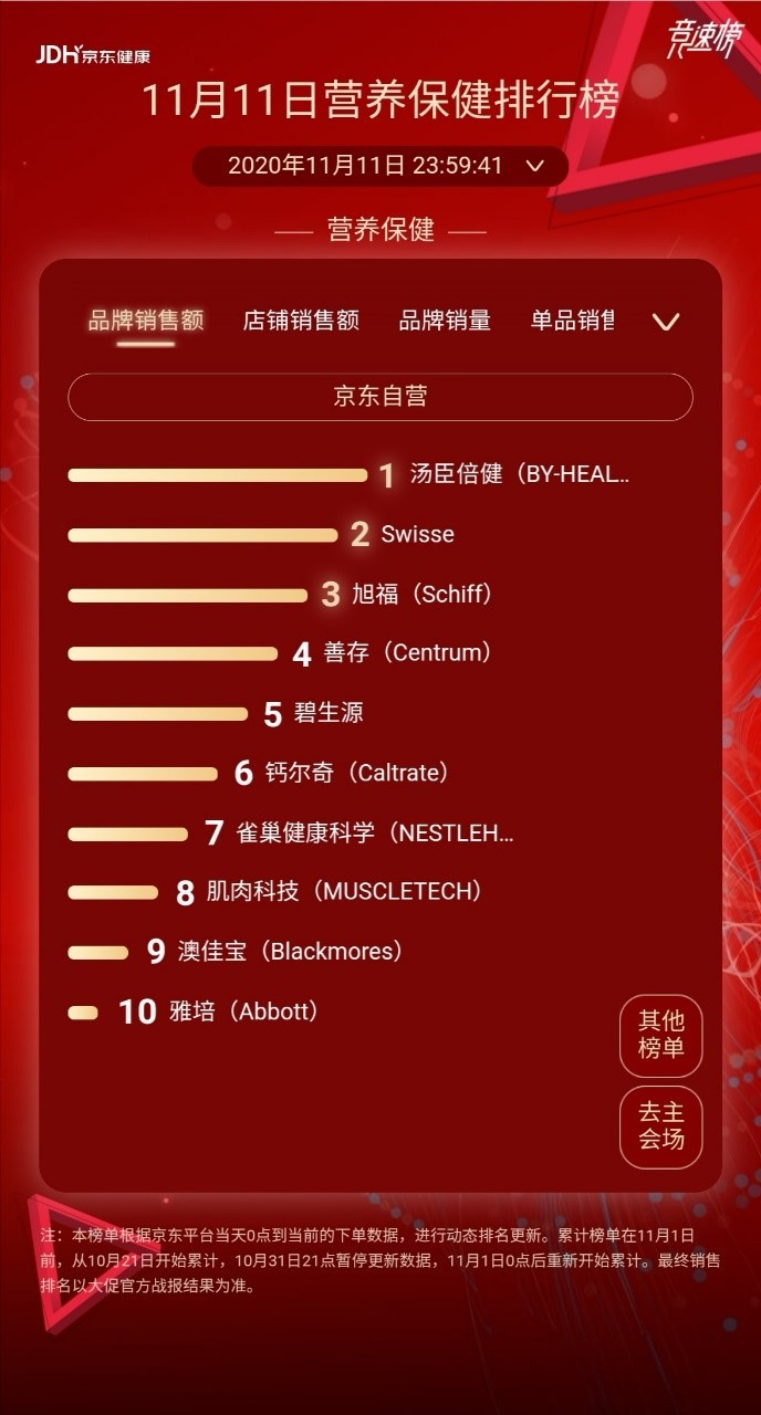 Data from Alibaba shows that in this year’s Tmall Double 11 Shopping Festival, the total sales of “BYHEALTH” surpassed RMB 170 million, and its official flagship store ranked first in sales, remaining the sales leader of all official flagship stores in dietary supplement category. Collagen and protein powder showed brilliant performance, winning TOP 1 selling spot in their respective categories. Also, "Life-Space" ranked first in cross-border probiotics on the same platform.
