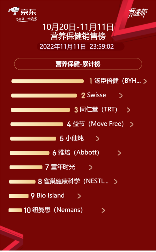 According to data from sz.jd.com②, “BYHEALTH” ranked TOP 1 of nutrition and health brand on JD.COM. Only after one minute since the start of promotion, BYHEALTH achieved a cumulative sales of over 100,000 items (20: 00, October 31 - 20: 01, November 10), ranking Top 1 on JD Health among nutrition and healthcare brands, and Top 1 in protein powder and collagen categories.
